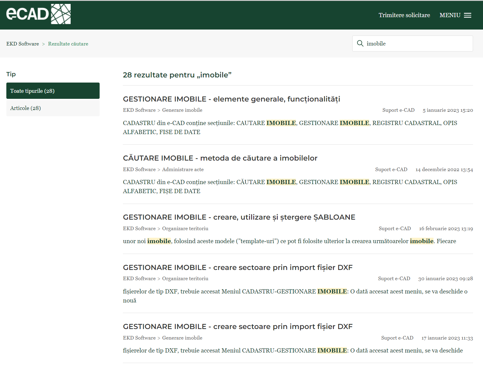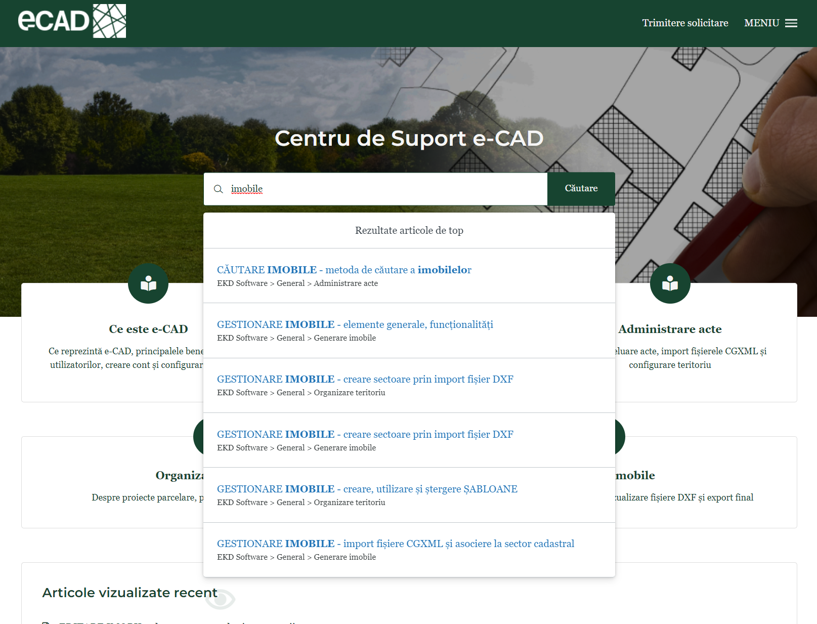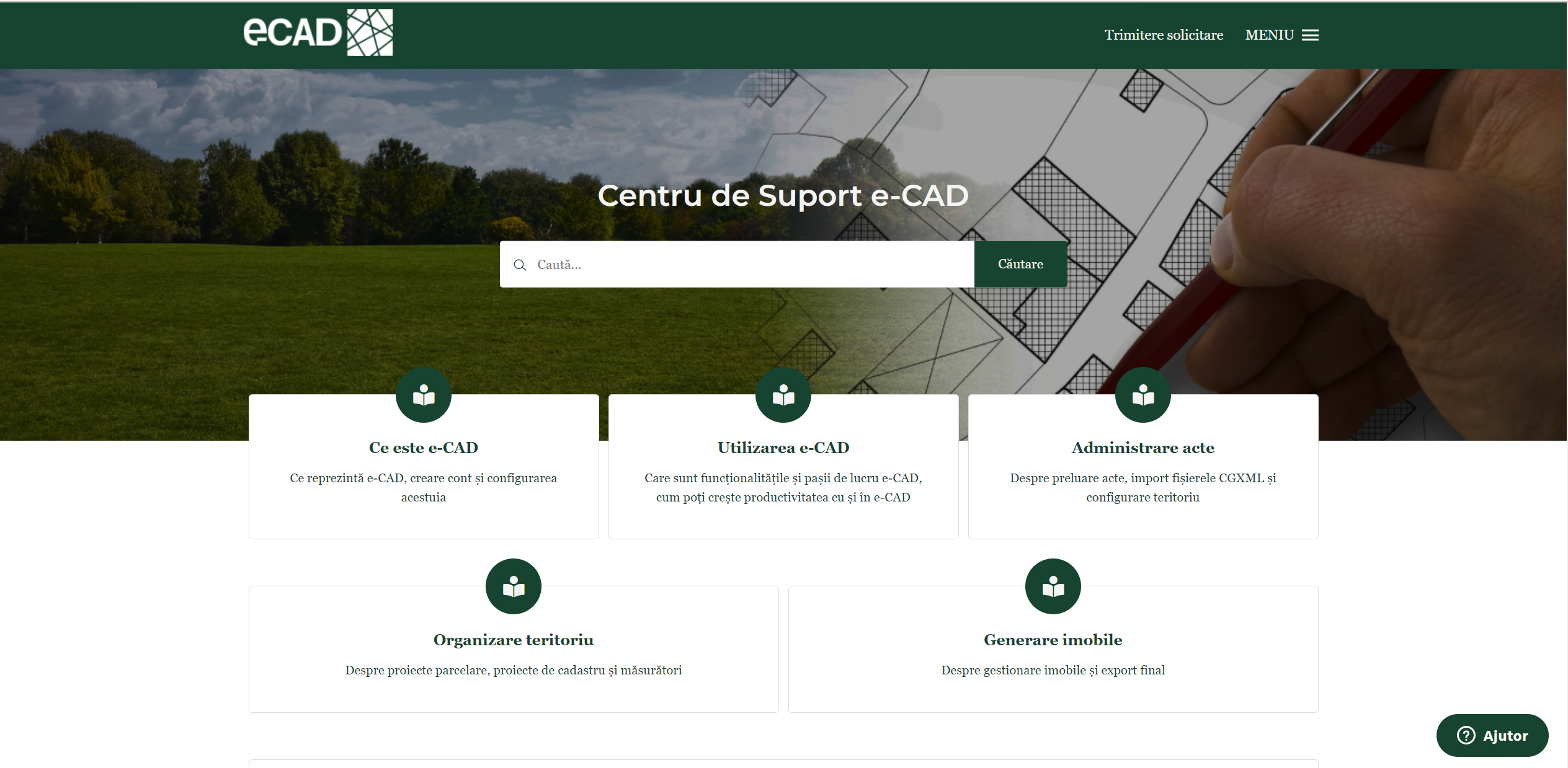 Centrul de suport dedicat clienților e-CAD, cuprinde o varietate de articole structurate pe categorii, de tip informativ și educativ, cu privire la toate funcționalitățile aplicației: