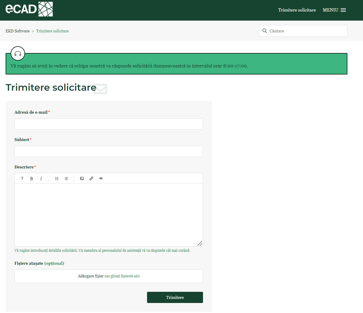 , ce se regăsește atât în partea de sus a paginii - în bară, cât și în partea de jos, va deschide o pagină nouă în care se completează anumite date cu scopul contactării echipei de suport e-CAD: