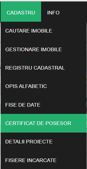 Odată prelucrate imobilele și certificatele de posesor ulterior introduse în e-CAD după id-ul aferent fiecărui imobil puteți verifica sectoarele daca conțin certificat de posesor sau dacă mai sunt imobile cu erori selectând Cadastru - Certificat de Posesor :